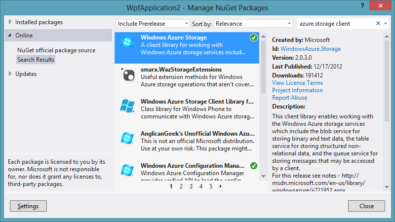 Search for “azure storage” and install the “Windows Azure Storage” NuGet Package by Microsoft.